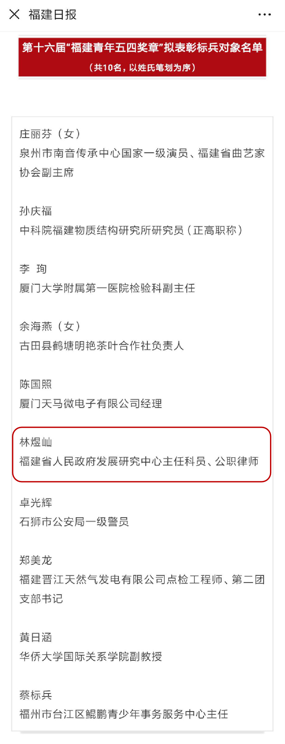林煜屾,男,中共党员,硕士研究生,福建师范大学协和学院经济与法学系法学专业2010届毕业生,现任省政府发展研究中心主任科员、公职律师。参加工作以来,林煜屾同志始终坚持干一行、爱一行、钻一行,敬业奉献,公正廉洁,在平凡岗位上书写无悔青春,展现出新时代青年干部良好精神风貌。